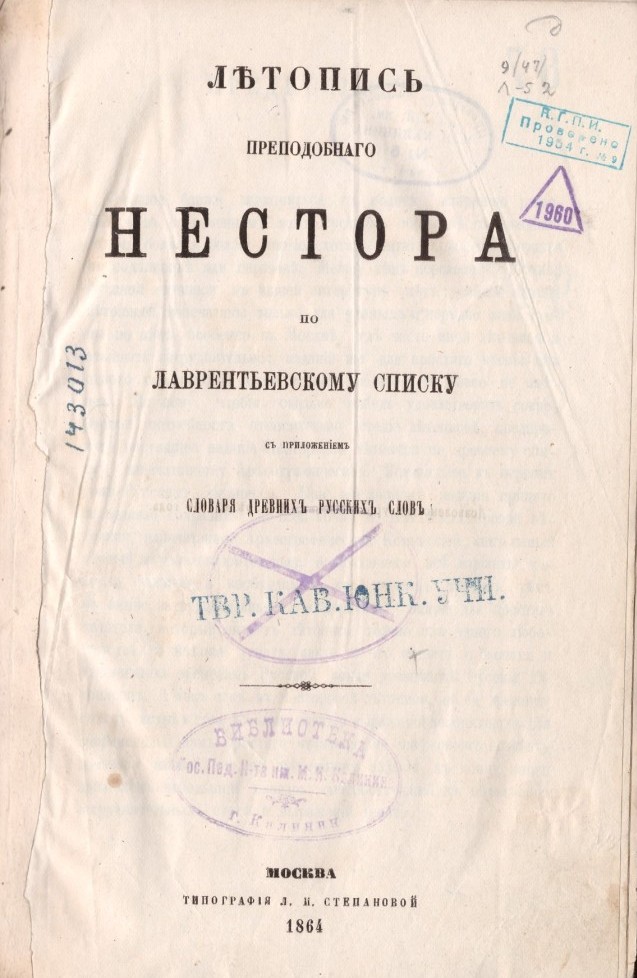 3. Летопись преподобного Нестора по Лаврентьевскому списку : c приложением словаря древних русских слов. - Москва : типография Л. И. Степановой, 1864. - [3], 172 с. ; 23,2 ; 22,4 см. - Словарь : с. 167-172.