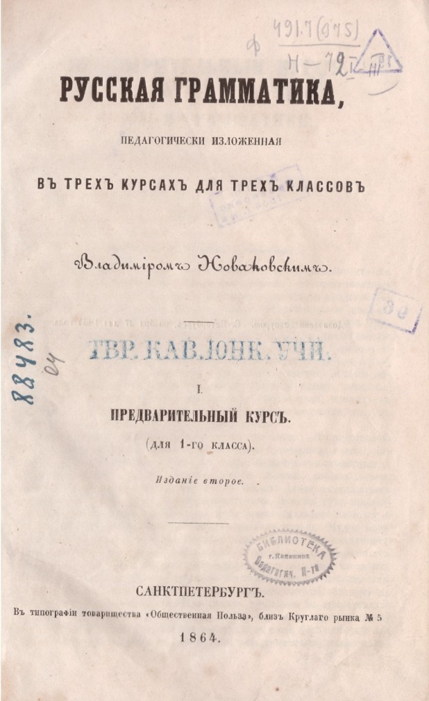 4. Новаковский В. И. Русская грамматика, / В. И. Новаковский. - 2-е изд. - Санкт-Петербург : типография Товарищества "Общественная польза", 1862-1866. - [226] c. разд. паг. ; 21 см. - Содерж.: Предварительный курс (для 1-го класса); Этимологический курс (для 2-го класса); Синтаксический курс (для 3-го класса) [напеч. в тип. Штаба воен.-учеб. заведений].