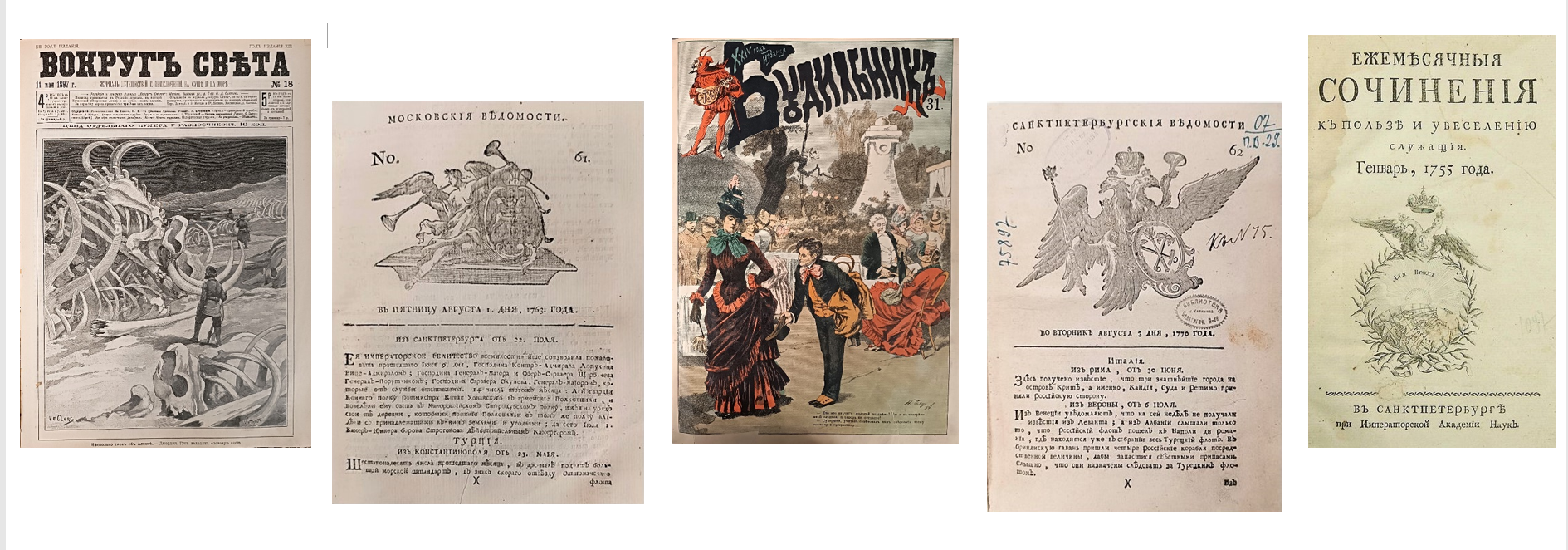 7. «Ежемесячные сочинения к пользе и увеселению служащие» / ред. Г. Ф. Миллер. — Санкт Петербург : Имп. Акад. наук, 1755, 1756, 1762, 1764.